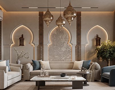Elegant geometric designs, arches, mosaics, and calligraphy elements blend with luxurious textiles to create timeless cultural expressions.